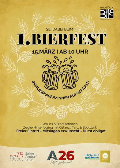 Im Rahmen des Innviertler Biermärz steht Andorf ganz im Zeichen einer besonderen „Schöpfung“. Beim Andorfer Bierfest im Landhotel Gasthof Bauböck wird das Jubiläumsbier „A26“ offiziell aus der Taufe gehoben – eine Hommage an jene Zeit, in der die Marktgemeinde Andorf ihren Namen erhielt.