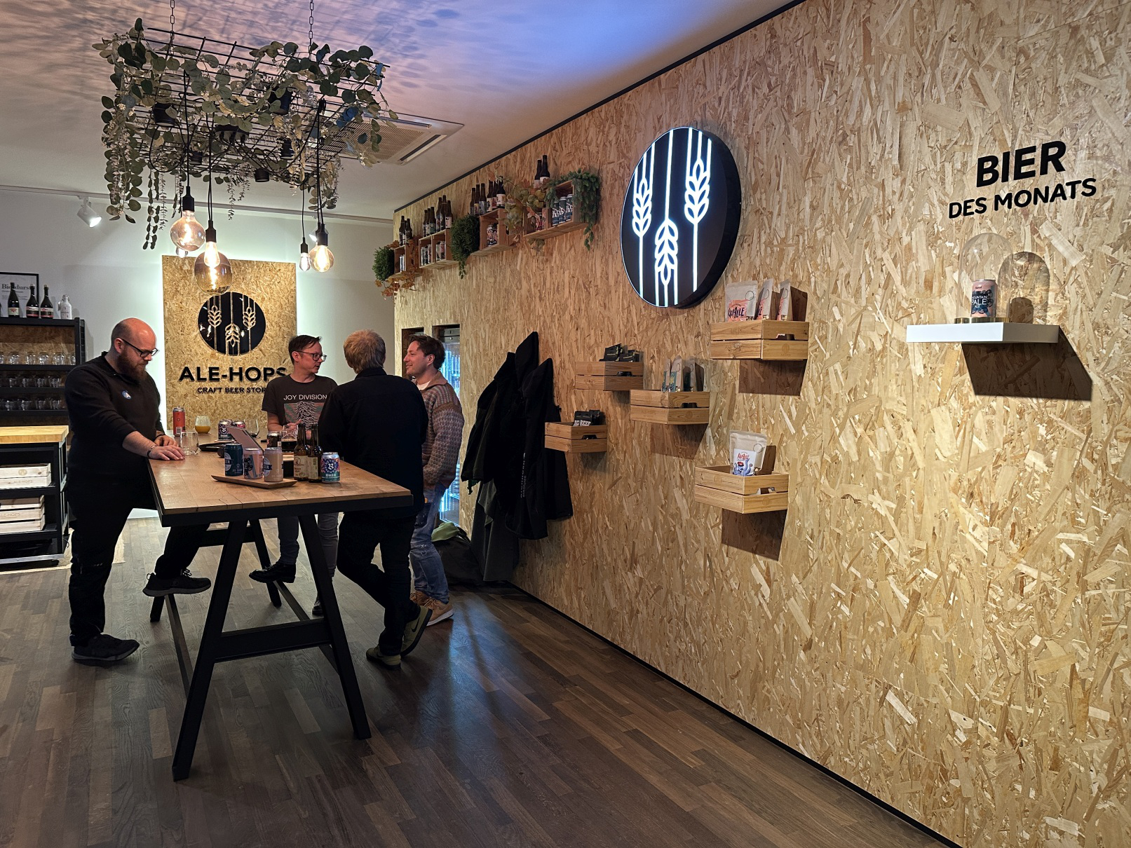 Viele Craftbiere sind Frischeprodukte, die möglichst gekühlt gelagert werden sollten. Das ist ein Teil der Erklärung dafür, dass sehr viele der in diesem Craft Beer Store angebotenen Flaschen und Dosen in den großen Getränkekühlschränken stehen. Der andere Grund ist natürlich, dass viele Kunden erst einmal probieren wollen, bevor sie größere Mengen der raren und nicht ganz billigen Biere aus den kleinen Brauereien kaufen - und das kann man hier eben auch: Es gibt einen Stehtisch, an dem man mal ein Bier trinken und mit anderen Kunden und den Geschäftsführern Romed Haberl und Clemens Pierer über Hopfenaromen und Alegeschmack fachsimpeln kann. Zu essen gibt es nur Popcorn - in verschiedenen, aber stets süßen Sorten von der Popkonditorei Knalle in Berlin. Der "craftige" Eindruck dieses im Herbst 2022 eröffneten Geschäfts wird dadurch verstärkt, dass es kleine handgefertigte Kisten aus Holz gibt, in denen man das Bier mitnehmen kann.