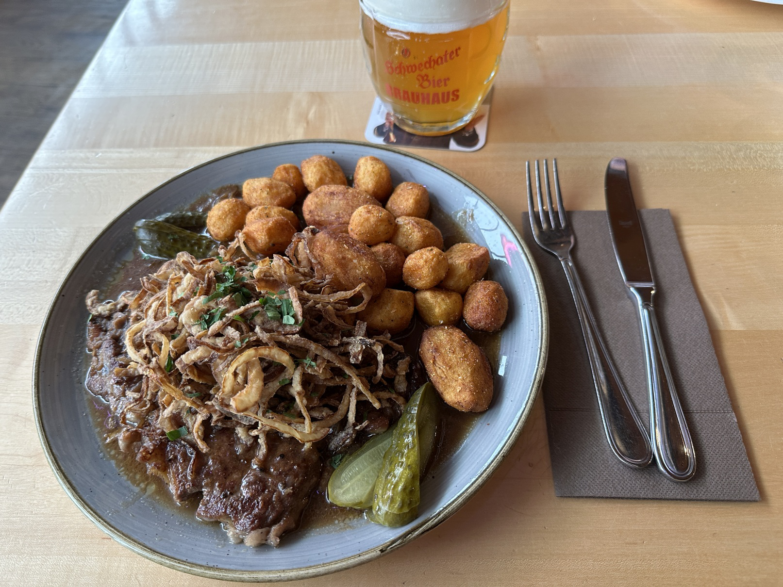 Biergartenstimmung und Brauhausatmosphäre in unmittelbarer Nachbarschaft der Schwechater Brauerei, an deren Tradition auch ein alter Bierwagen vor der Tür und eine Skulptur der Braureibüffel erinnert: Sehr schön gestaltetes modernes Bierlokalkonzept, das seit dem April 2025 von Rene Dubeci gepflegt wird – gleich zum Einstand gab es einen Osterbockanstich. Und das Wiener Lager vom Schwechater Braumeister Andreas Urban ist ohnehin ein wie eine Ikone verehrtes brautechnisches Erbe, das aus Anton Dreher zurückgeht. Zur Erstpräsentation des wiederbelebten Wiener Lagers kamen Gäste sogar aus Japan und England. Kulinarisch wird bodenständige, bierige Brauhausküche geboten. 240 Sitzplätze, 300 im Garten.