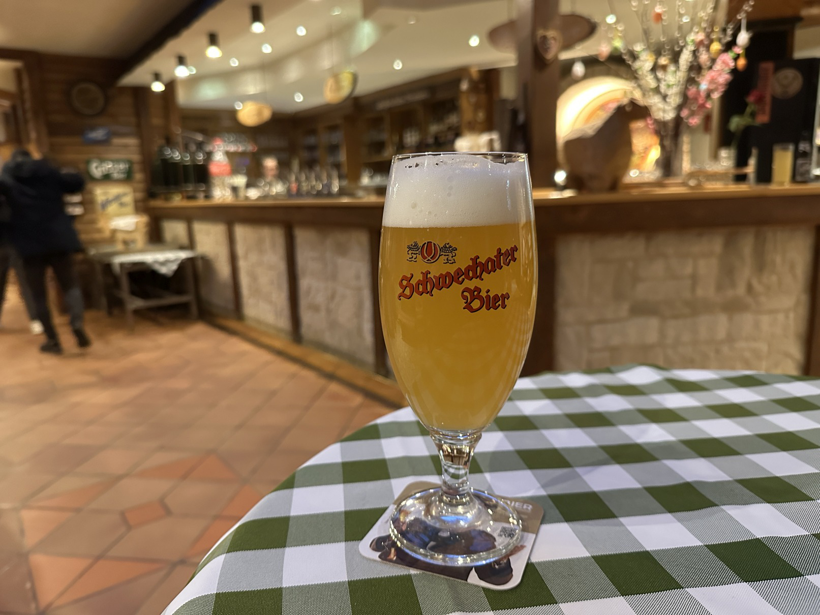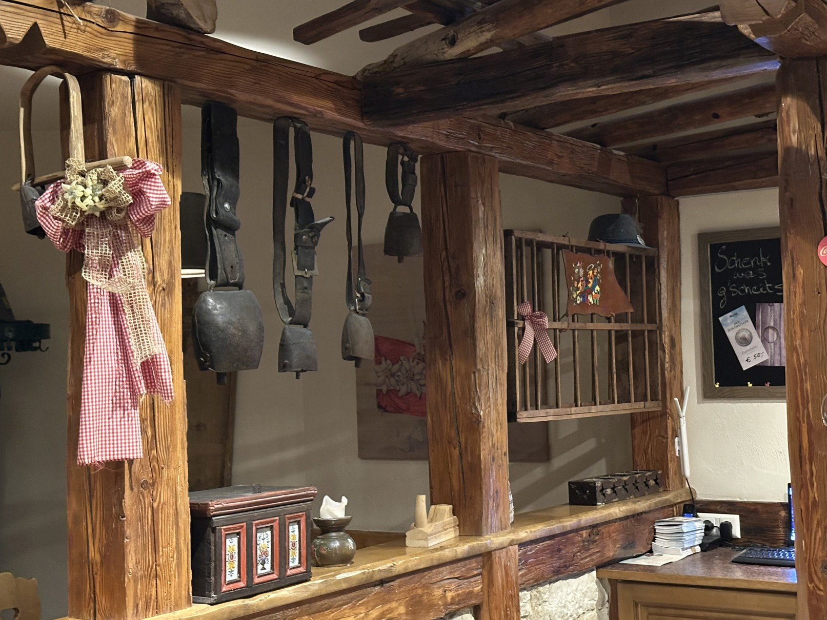 Ein Schlitten, ein Melkschemel und ein Leiterwagen über der Bar, ein Pflug, eine Sense, ein Heurechen über der Rezeption, Bierwerbung an den Wänden und Kuhglocken als Lampenschirme. Und alte Trachtenkleidung - hindrapiert, als ob gleich die Oma oder der Opa käme, sie wieder anzuziehen. Man kann all das kitschig finden. Oder aber als gelungene Inszenierung eines Bierlokals als Almhütte interpretieren. Das Service ist freundlich, die Bierpflege gut und natürlich gibt es auch alpin geprägte Speisen. Veranstaltungen, wie z. B. Almauftrieb, Nacht in Tracht. 350 Plätze im Lokal. 150 Plätze im Innengarten und weitere 50 Plätze im vorderen Gartenbereich.