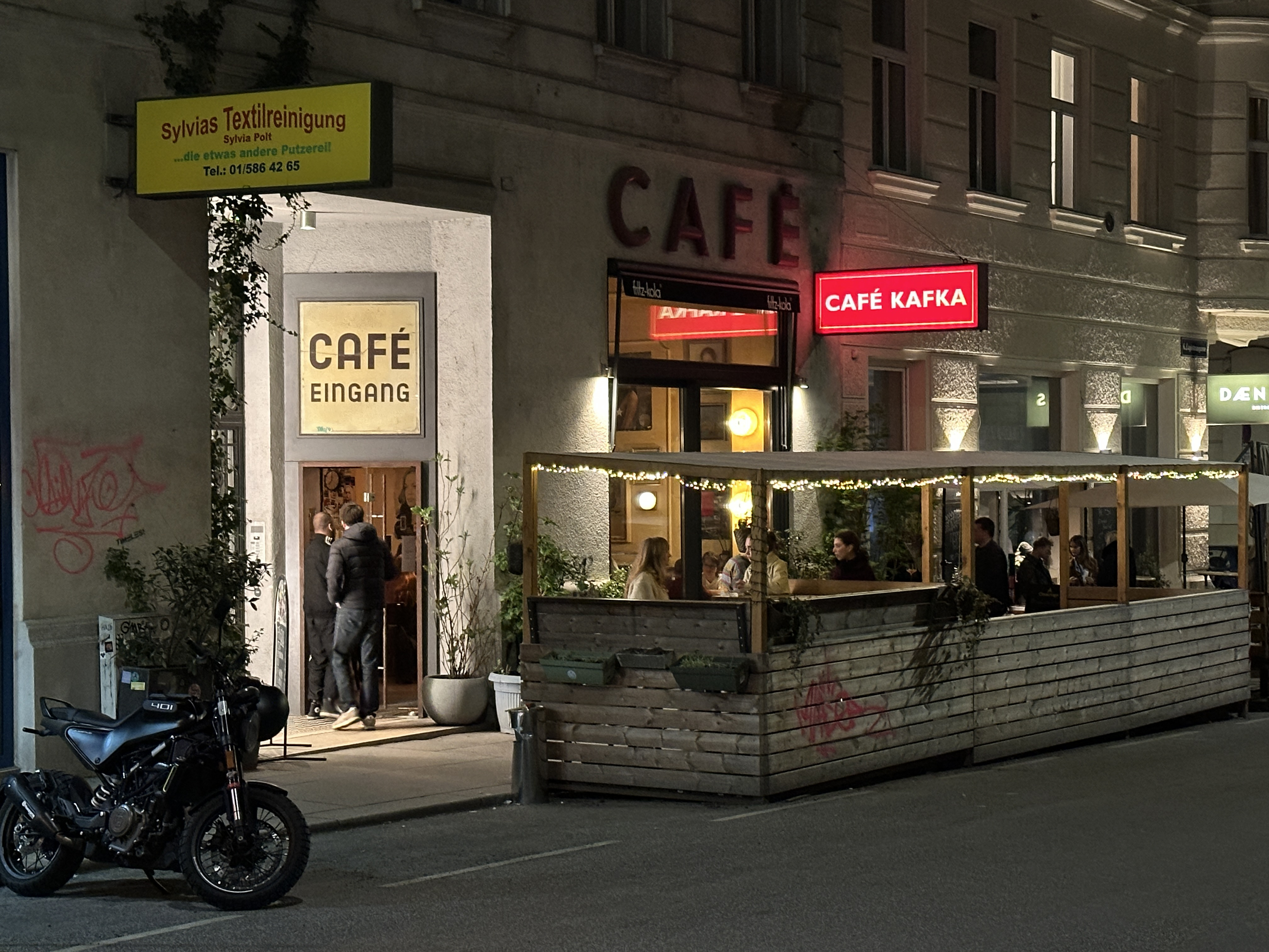 Dieses kleine Café hat eine über 100 Jahre währende Geschichte als Künstler- und Studententreff – unter dem jetzigen Namen firmiert es auch schon ein Vierteljahrhundert. Kleine Marmortischchen, gepolsterte Sitzbänke, alte Bilder (natürlich auch ein Portrait von Franz Kafka) und neue Plakate prägen das Ambiente. Das Publikum wirkt studentisch, ein bisserl so wie schon in den 1970er Jahren. 40 Plätze im Lokal, 22 im Schanigarten.