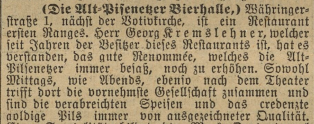 Dieses historische Café-Restaurant war ursprünglich die noble Alt-Pilsenetzer Bierhalle, über die das "Illustrierte Wiener Extrablatt" am 9. Oktoberr 1901 zu berichten wusste: "Ist ein Restaurant ersten Ranges. Herr Georg Kremslehner, welcher seit Jahren Besitzer dieses Restaurants ist, hat es verstanden, das gute Renommée, welches die Alt-Pilsenetzer immer besaß, noch zu erhöhen. Sowohl mittags, wie abends, ebenso nach dem Theater trifft dort die vornehmste Gesellschaft zusammen und sind die verabreichten Speisen und das kredenzte goldige Pils immer von ausgezeichneter Qualität." Abgesehen davon, dass sich das Lokal mit seinen hohen Fenstern und den schönen alten Wandmalereien, heute zeitgemäß renoviert präsentiert, ist das Qualitätsversprechen weiterhin aufrecht. Statt dem längst vergessenen Alt-Pilsenetzer Bier gibt es Ottakringer Pils - und das wird wie eh und je mit Liebe gezapft. 60 Plätze im Lokal, 10 an der Bar