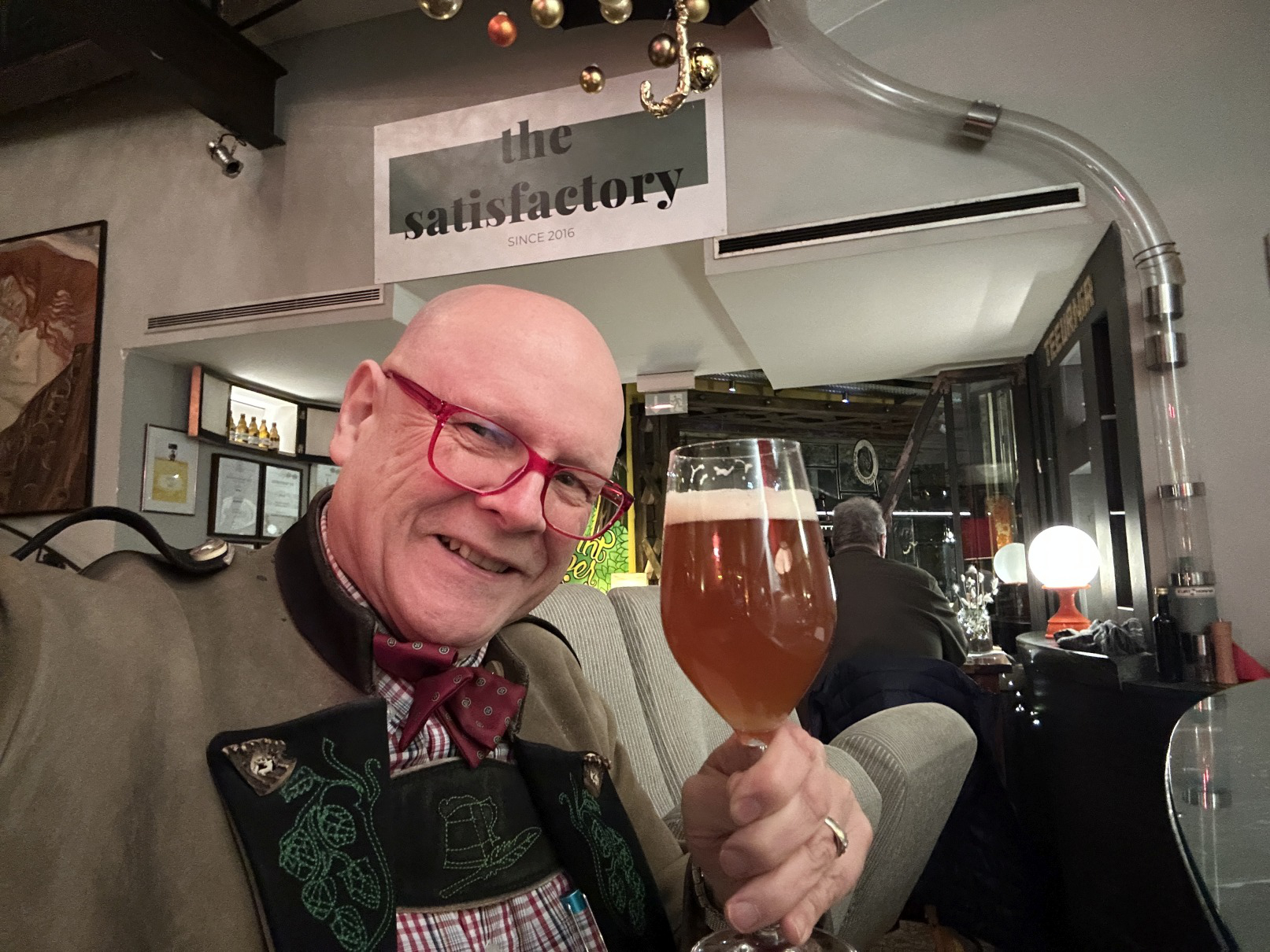 The Satisfactory ist ein Lokalkomplex, der immer wieder umgebaut wird und mit neuen Eindrücken überrascht. Gebraut wird das eigene 'Gärage' Bier, in denselben Räumlichkeiten ist auch eine Thai-Küche, eine "Bäckstage" (auf der Pizza gebacken wird) und ein Smoker untergebracht. Mit 'Thai-Bier-Inha' und 'Stout Sauga' gibt es auch zwei Cocktails. Die Möblierung besteht aus frisch aufgemöbelten Kino-, Flugzeug- und Reisebussitzen, dazu Pflanzen, die an den Weltladen nebenan erinnern. Wer länger bleiben will, kann im angeschlossenen Hotel Post nächtigen, in dem einige Zimmer mit Bier-Thema eingerichtet sind - mit dem Codewort "Feierabend" gibt es dort eine Ermäßigung. 100 Plätze im Lokal, 30 an zwei Bars, 20 auf der Sonnenterrasse über dem Hauptplatz.