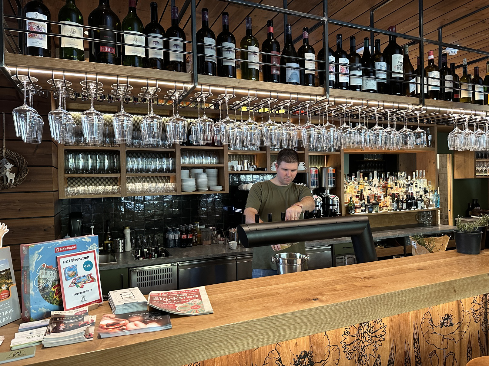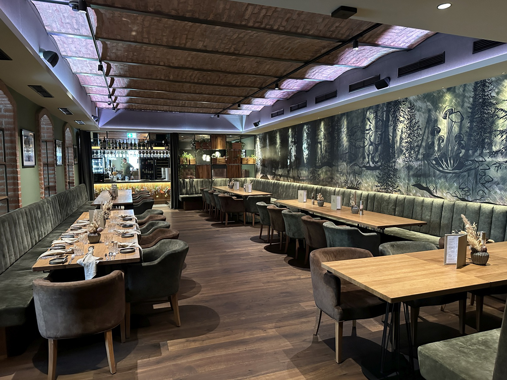 Wald & Wiese versteht sich atmosphärisch als Schnittstelle zwischen Umgebung und Teller oder Glas. Wer eintritt, landet in einem hybriden Raum zwischen Bar und Restaurant, der mit viel Holz, warmem Licht und dekorativen Leuchten eher auf urbanes Landhaus als auf klassisches Wirtshaus setzt. Im vorderen Bereich, wo man schon zum Frühstück einkehren kann, kann man durch eine Glasplatte in einen tiefen Brunnen schauen - ebenso wie das Ziegelgewölbe im Restaurantbereich ein Hinweis auf die alte Bausubstanz. An der zentralen Schank und an der Bar lässt sich ohne Weiteres auch nur auf ein Glas bleiben; die offene Anlage des Gastraums und der angeschlossene Gastgarten machen den Besuch für Biertrinker attraktiv, die nicht zwingend ein komplettes Menü bestellen möchten. Die Karte setzt auf regionale und saisonale Küche mit österreichischem Einschlag, ergänzt um Angebote für Vegetarier und Veganer; gekocht wird mit Produkten aus der näheren Umgebung, was der Betreiberfamilie erklärtermaßen wichtig ist.