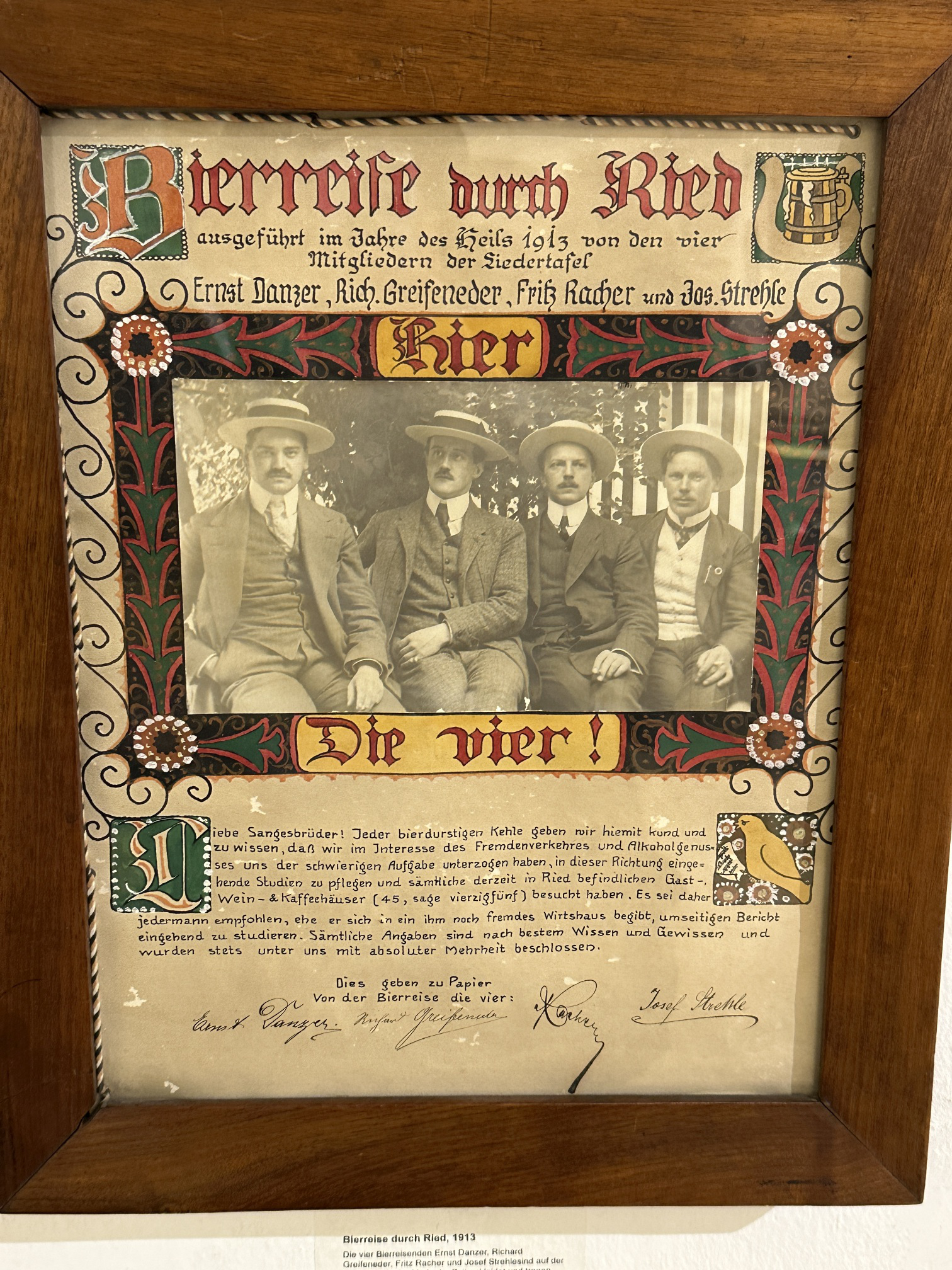 Ried im Innkreis - Die Rieder Liedertafel ist ein 1846 gegründeter Gesangsverein, der bis heute besteht. Die Aktivitäten dieser Sänger sind gut dokumentiert. Es ist jetzt 113 Jahre her, dass sich vier wackere Mitglieder der Rieder Liedertafel – Ernst Danzer, Richard Greifeneder, Fritz Racher und Josef Strehle – auf eine höchst genussvolle Mission begeben haben: Sie haben auf der „Bierreise durch Ried“ getreulich alle damals bestehenden Gaststätten der Bezirkshauptstadt der Reihe nach besucht. Und vor allem: Sie haben diese Besuche penibel dokumentiert. „Eine Art früher Gault Millau“, nennt es Sieglinde Frohmann, die Direktorin des Innviertler Volkskundehauses. Sie hat die Dokumentation aufgearbeitet und mit vielen Exponaten (vom Gambrinus-Krug bis zu Raufwerkzeugen) sowie einer Fotodokumentation verschwundener Lokale zu einer prächtigen Ausstellung der regionalen Bier- und Wirtshauskultur gestaltet.